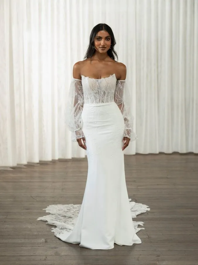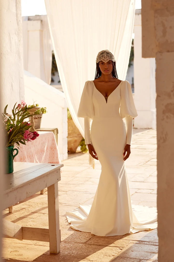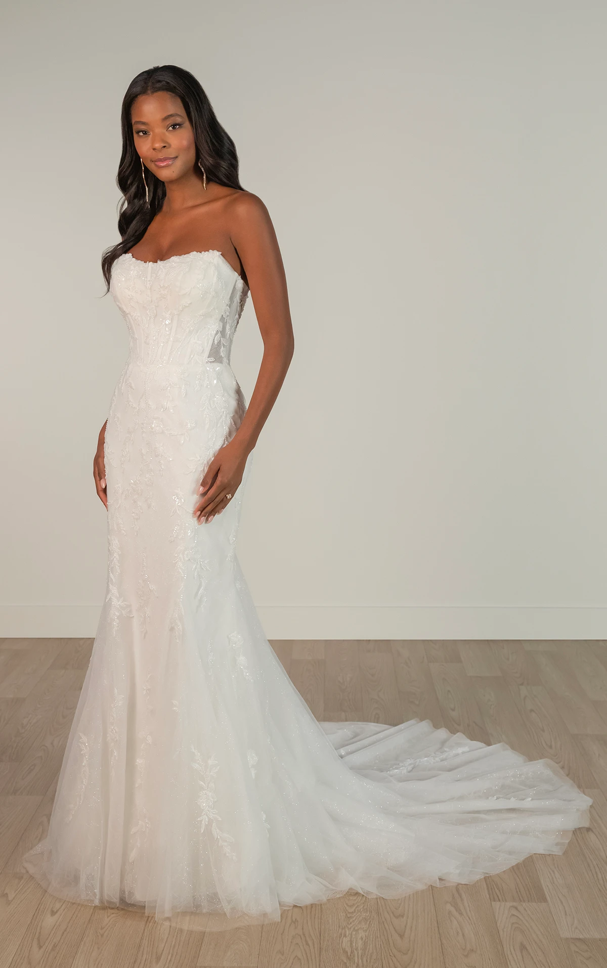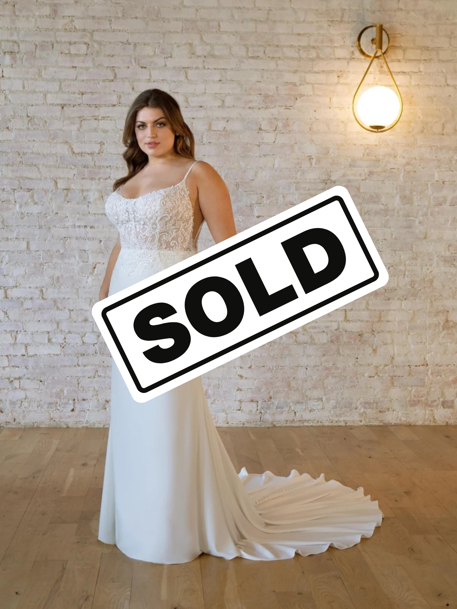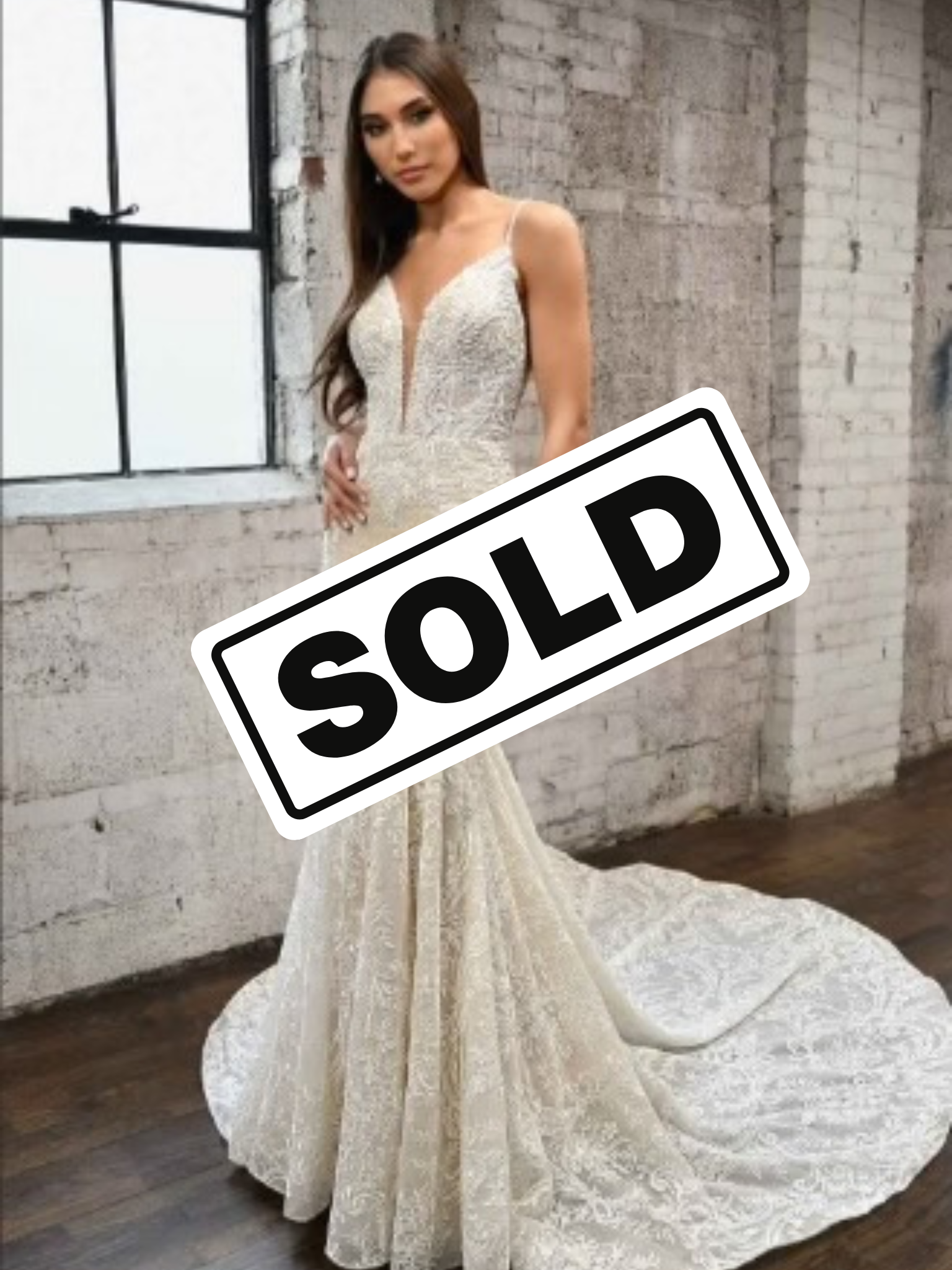 Most gowns will be sample size 14, which is closest to a street size 10. This does not rule out those brides smaller than a 10! We have a very talented in-house seamstress and she can make any gown fit perfectly. If you’re looking for sample sizes larger than 14, please reference the inventory below!